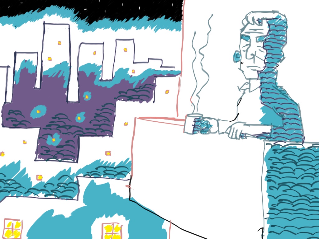 „Ich arbeite daran“, sagte Herr Kühne leise. Es war inzwischen fast dunkel geworden und er betrachtete wie in einem Trancezustand die zitronengelb und tomatenrot flackernden Lichtstecknadelköpfe, die das Häuser- und Straßengewirr in nicht zu weiter Ferne überzogen. Nur hier flackerten sie so und nirgendwo sonst, fand Herr Kühne.